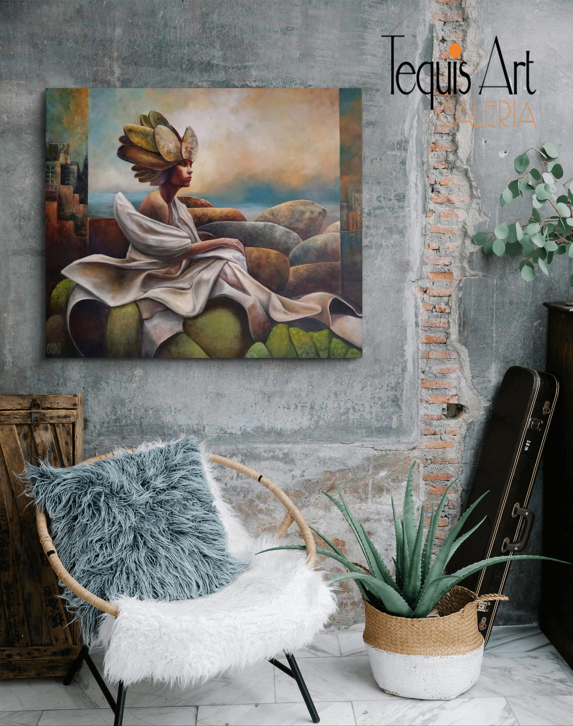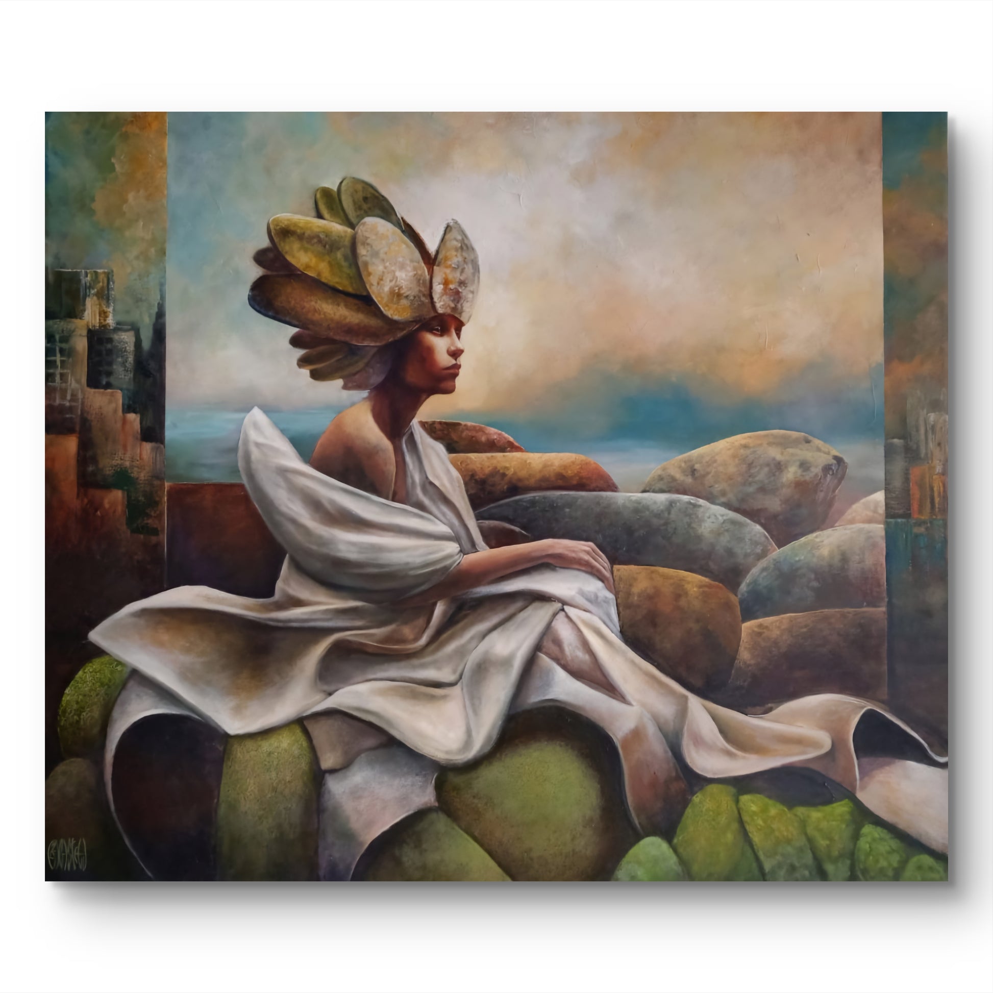 Óleo que representa una figura masculina en actitud contemplativa, sentada entre piedras orgánicas que evocan la naturaleza y el paso del tiempo. La obra transmite introspección, transición y sensibilidad, simbolizando la adolescencia como una etapa de búsqueda interior, formación de identidad y conexión profunda con el entorno.