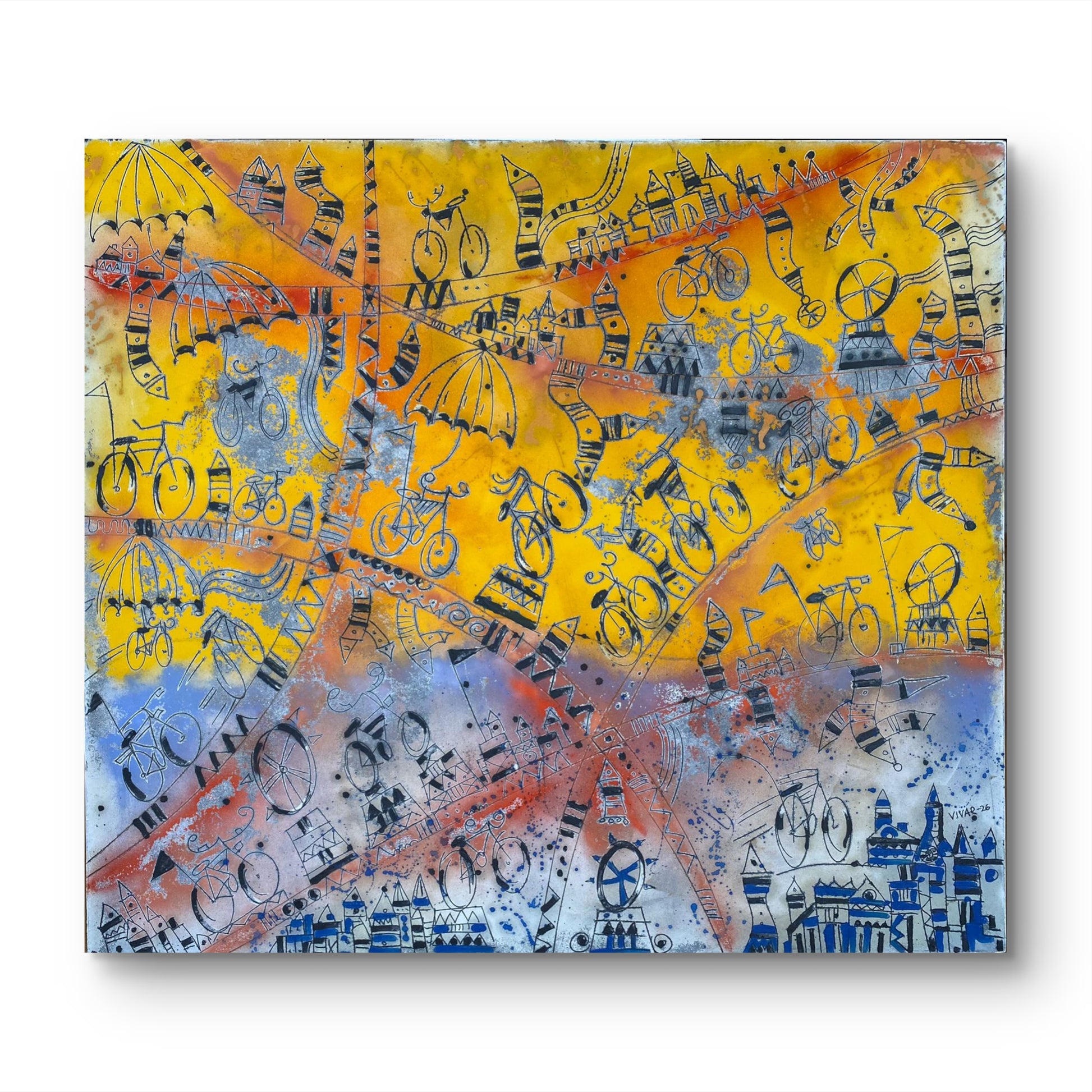 “Mundo Bicicletero” es una obra de técnica mixta sobre tela del artista Carlos Vivar, donde una multitud de bicicletas, estructuras arquitectónicas y formas geométricas se entrelazan en una composición vibrante y dinámica. Con una paleta dominada por amarillos, azules y ocres, el artista construye un universo imaginario lleno de movimiento y ritmo visual. Las líneas espontáneas y los elementos repetidos evocan la energía de la vida urbana, transformando la bicicleta en un símbolo lúdico de desplazamiento, libertad y conexión entre espacios.
