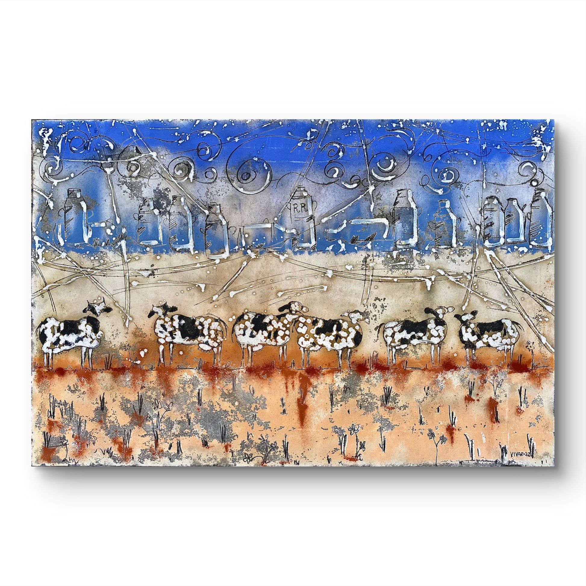 “Solo Vacas” es una obra de técnica mixta del artista Carlos Vivar que representa una escena rural estilizada donde un grupo de vacas aparece alineado sobre un paisaje abierto. Con una paleta dominada por azules, ocres y blancos, el artista combina trazos sueltos, salpicaduras y líneas gestuales para crear una atmósfera dinámica y poética. La composición mezcla elementos del campo con estructuras sugeridas en el horizonte, generando un diálogo entre lo natural y lo humano característico del lenguaje visual expresivo de Vivar.