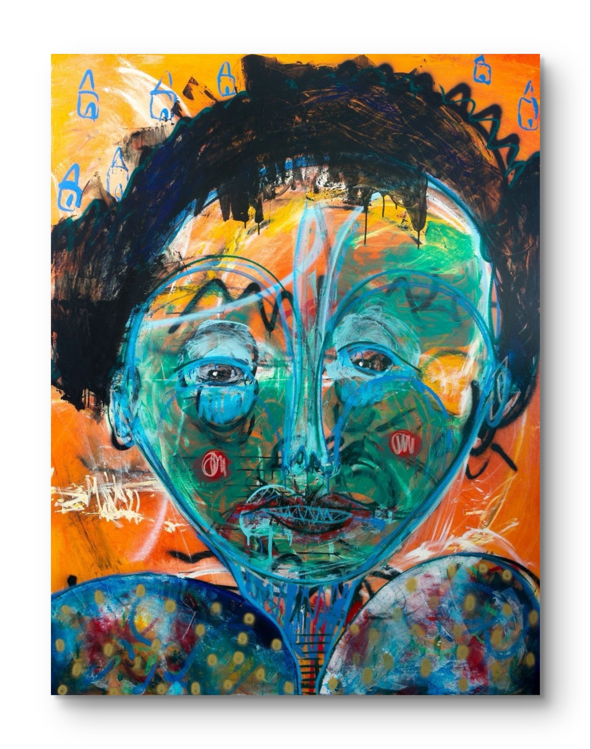“Ánima” de Aper y Manuel Aubert es una obra expresionista cargada de fuerza y color, donde un rostro humano se descompone en trazos intensos y contrastes vibrantes. El uso del azul y el verde en la figura central contrasta con el fondo naranja ardiente, evocando una dualidad entre lo espiritual y lo terrenal. La pintura transmite una energía visceral, como un reflejo del alma en estado crudo y profundo.