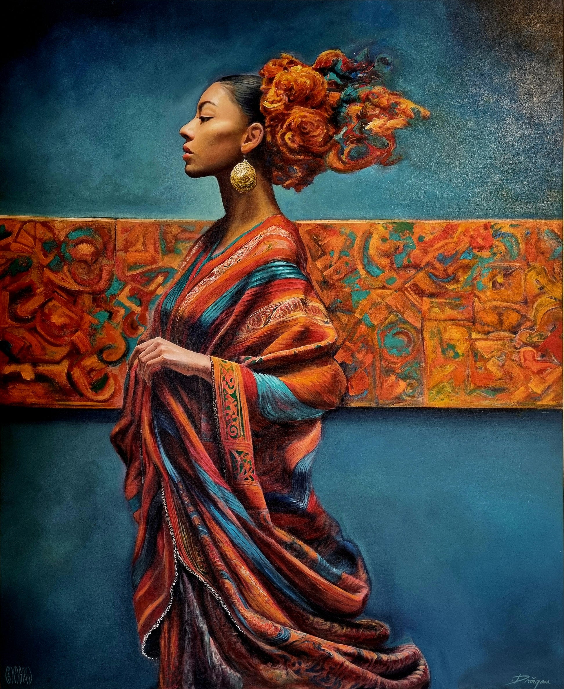 La obra “El Orgullo de Ser”, de la colección “Mágicos” de Mauricio Sagástegui y Alina Drăgan, es una exaltación de la identidad y la fuerza interior femenina. Con una técnica que combina óleo y acrílico, los artistas capturan la elegancia y dignidad de una mujer envuelta en un manto de tonos cálidos, símbolo de herencia y tradición. Su porte altivo y sereno, junto con el fondo de motivos abstractos en naranja y turquesa, crean una atmósfera de introspección y poder. Esta pieza celebra la belleza de las raíces y el orgullo de pertenecer a una cultura viva y luminosa.