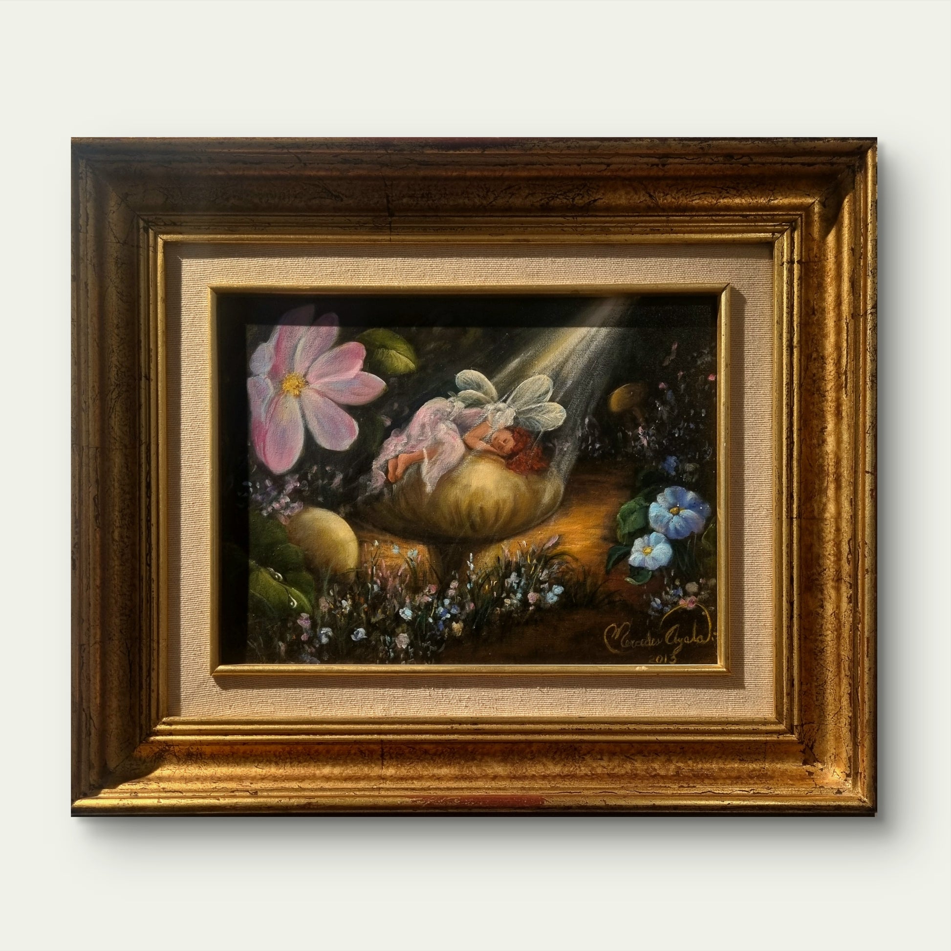 “Ensueño” es un óleo sobre tela de Mercedes Ayala que presenta una escena delicada y onírica donde un pequeño ser alado descansa entre flores y formas naturales. La iluminación suave que desciende desde la parte superior envuelve la composición en una atmósfera íntima y mágica, resaltando la fragilidad del personaje y la belleza del entorno. Con una paleta cálida y un tratamiento detallado de la luz y las texturas, la obra evoca un momento de calma, fantasía y contemplación.