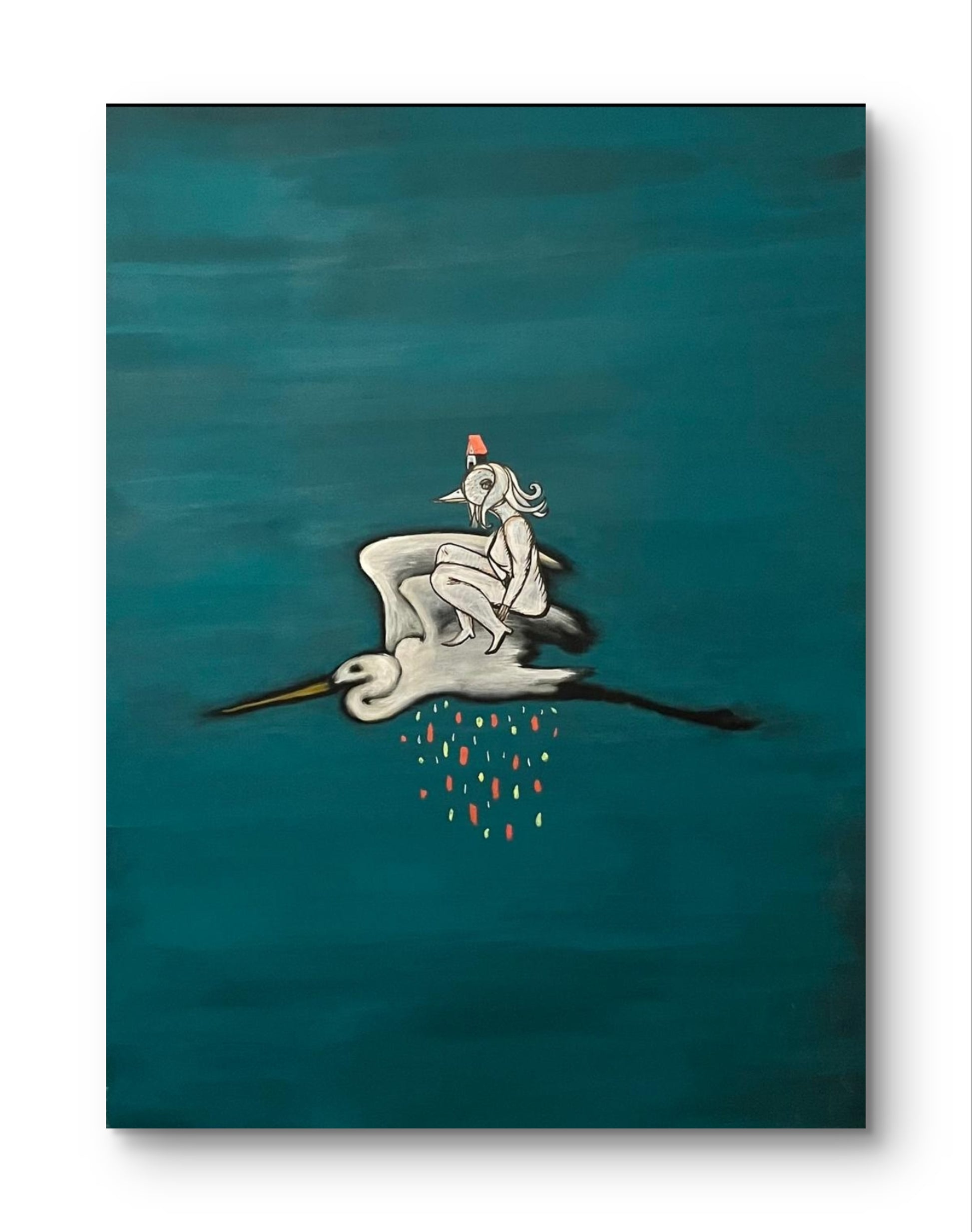 Obra mixta sobre tela donde una figura fantástica cabalga una garza blanca en pleno vuelo. Con un estilo onírico y simbólico, Ontiveros transmite la esencia de la libertad y el viaje interior, creando una pieza contemporánea que atrapa miradas y despierta imaginación.
