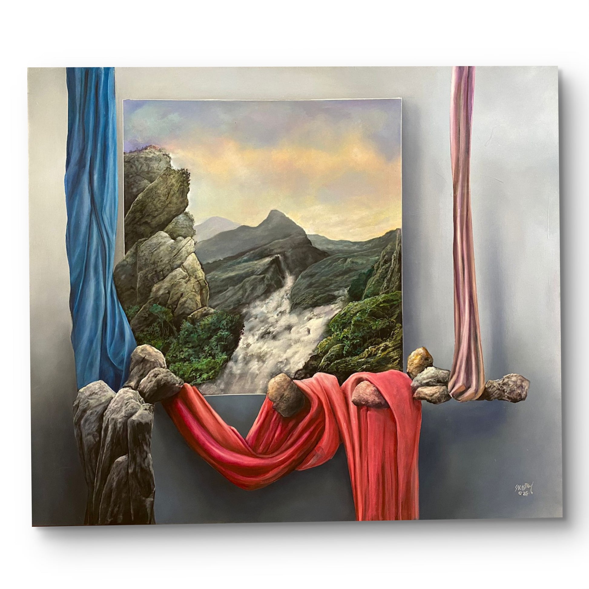 Óleo sobre tela de Oswaldo Sagástegui que presenta un paisaje montañoso con una cascada enmarcado dentro de una escena surrealista. El artista combina elementos naturales con rocas y telas suspendidas que parecen sostener y revelar la pintura central, creando un juego entre realidad y representación. Los pliegues de las telas y la fuerza del paisaje evocan contraste entre lo natural y lo simbólico, generando una atmósfera contemplativa y onírica.